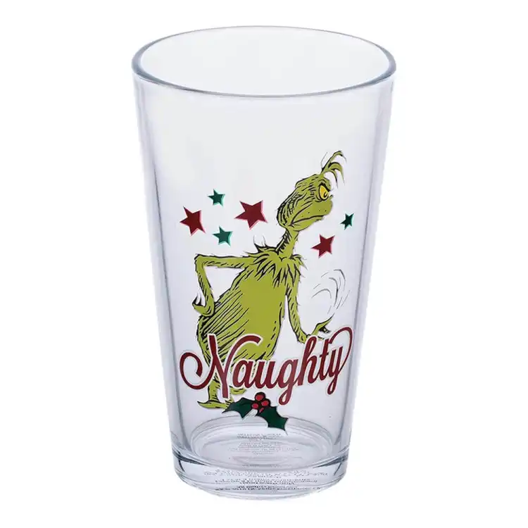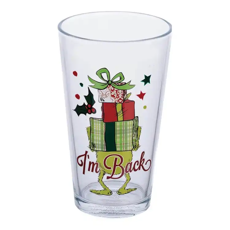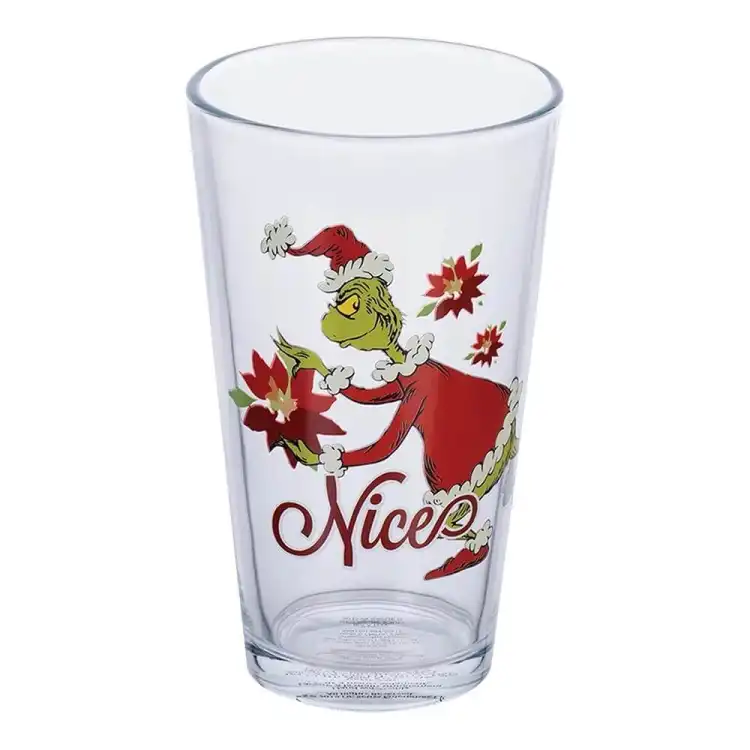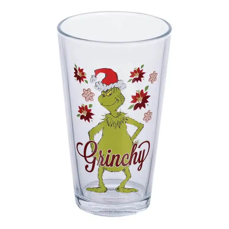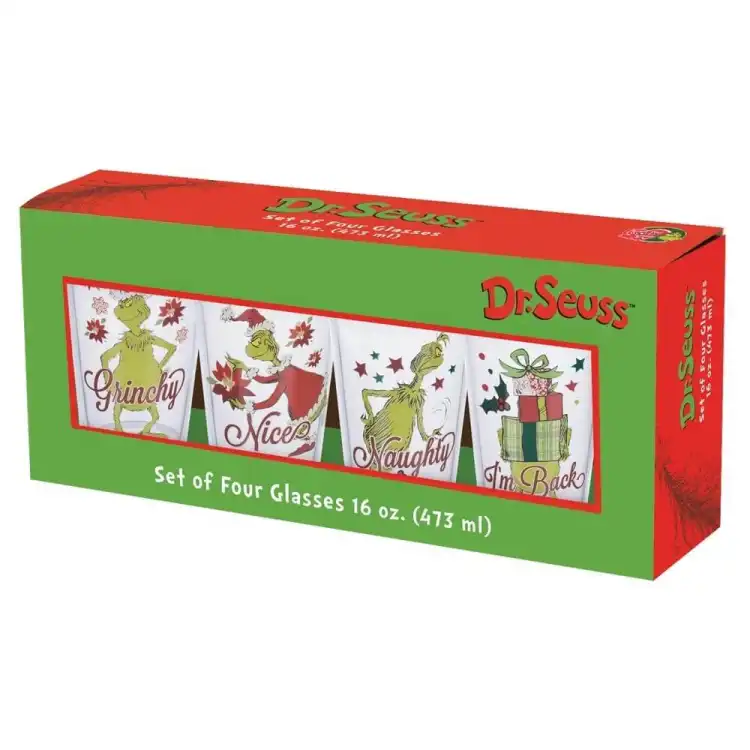 Celebrate the holiday season with our Dr. Seuss Grinchmas 16 Ounce Glasses. These glasses are perfect for sipping hot cocoa or festive cocktails with each glass featuring the Grinch in a different playful design. Crafted from durable glass, each 16-ounce glass adds a touch of cheer to your holiday gatherings. Ideal for gift-giving or as a fun addition to your home decor. Bring the magic of Grinchmas to every toast! Perfect for collectors and fans alike. The fully licensed Dr. Suess Grinchmas 4 piece glass set comes in a full color open front box perfect for gift giving! Each glass holds 16 ounces of your favorite holiday beverages. Great as a gift or for your own collection, these whimsical glasses will bring joy to any Grinchmas celebration.