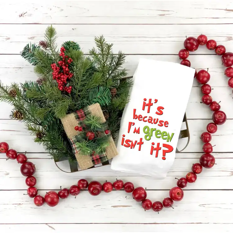 Add a touch of whimsy to your kitchen with our Grinch It's Because I'm Green Isn't It? Flour Sack Towel! Perfect for the holiday season or year-round fun, this extra large sized towel features the mischievous Grinch and his iconic to-do list. Made from high-quality heavy duty cotton fabric, it's both practical and charming. Ideal for gifting or as a delightful addition to your own home decor. Embrace the Grinch’s spirit and brighten your kitchen with this unique towel today!