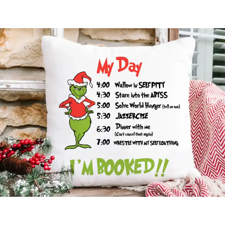 Transform your holiday decor with our Grinch My Day Christmas decorative throw pillow cover. Made from high-quality white polyester linen fabric, this cover features a hidden zipper closure for a sleek finish. Perfect for adding a whimsical touch to your couch or chair, it captures the playful spirit of the season. Ideal for Grinch enthusiasts, this pillow cover makes a delightful gift or festive accent. Make your holidays merry and bright with this charming design! You will need a 19x19 or 20x20 inch poly-fill insert or 18x18 inch feather down or down alternative insert.