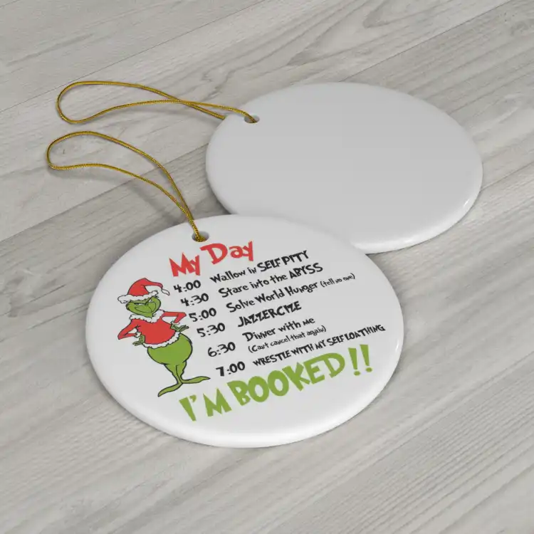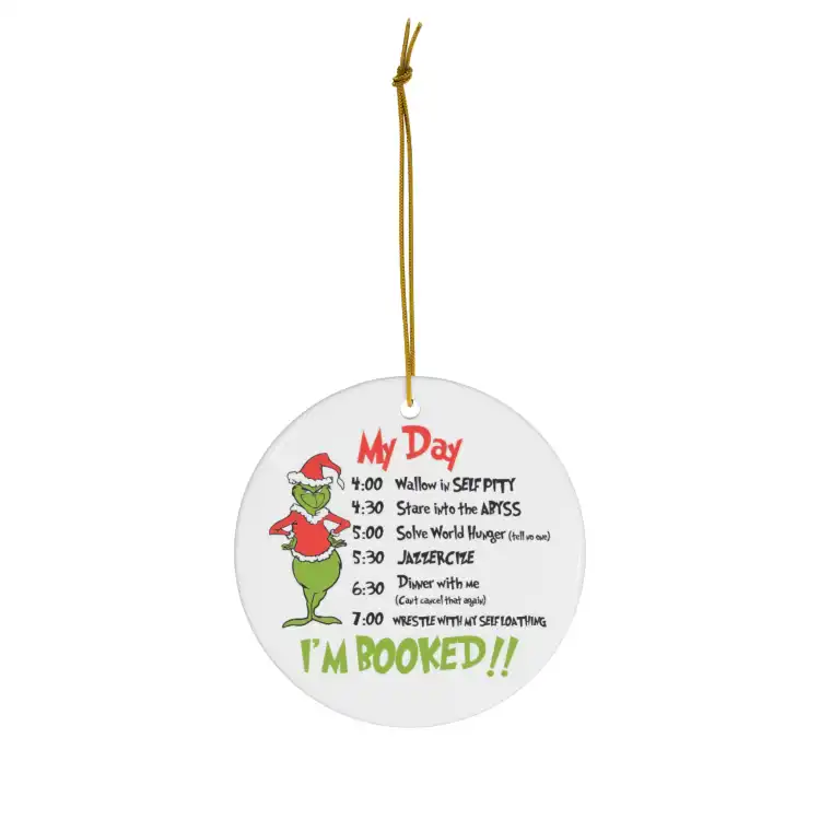 Celebrate the holidays with our delightful The Grinch My Day I'm Booked 3-inch ceramic Christmas ornament! Perfect for adding a touch of fun to your festive decor, this charming ornament comes beautifully packaged in a gift box, making it an ideal present for friends and family. Capture the whimsical spirit of the season and showcase your love for this classic character. Hang it on your tree or give it as a special gift—either way, it's sure to bring joy and laughter!
