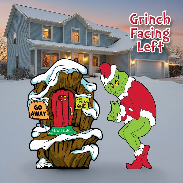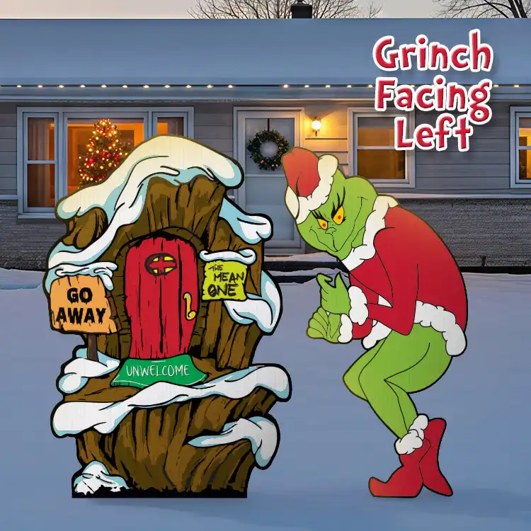 This Christmas Yard art set includes the Grinch and his nefarious Lair.