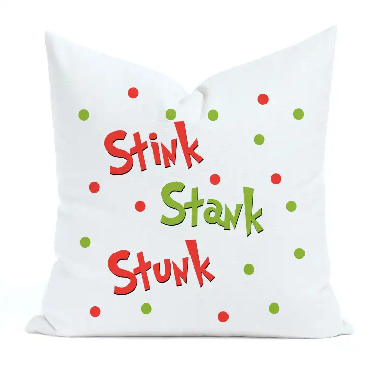 Transform your holiday decor with our Grinch Stink Stank Stunk Christmas decorative throw pillow cover. Made from high-quality white polyester linen fabric, this cover features a hidden zipper closure for a sleek finish. Perfect for adding a whimsical touch to your couch or chair, it captures the playful spirit of the season. Ideal for Grinch enthusiasts, this pillow cover makes a delightful gift or festive accent. Make your holidays merry and bright with this charming design! You will need a 19x19 or 20x20 inch poly-fill insert or 18x18 inch feather down or down alternative insert.