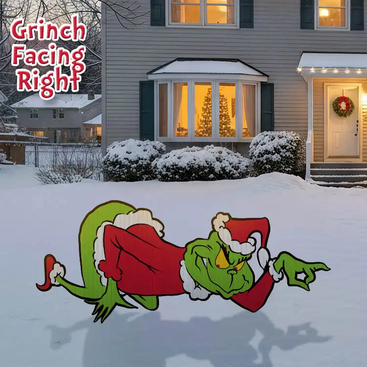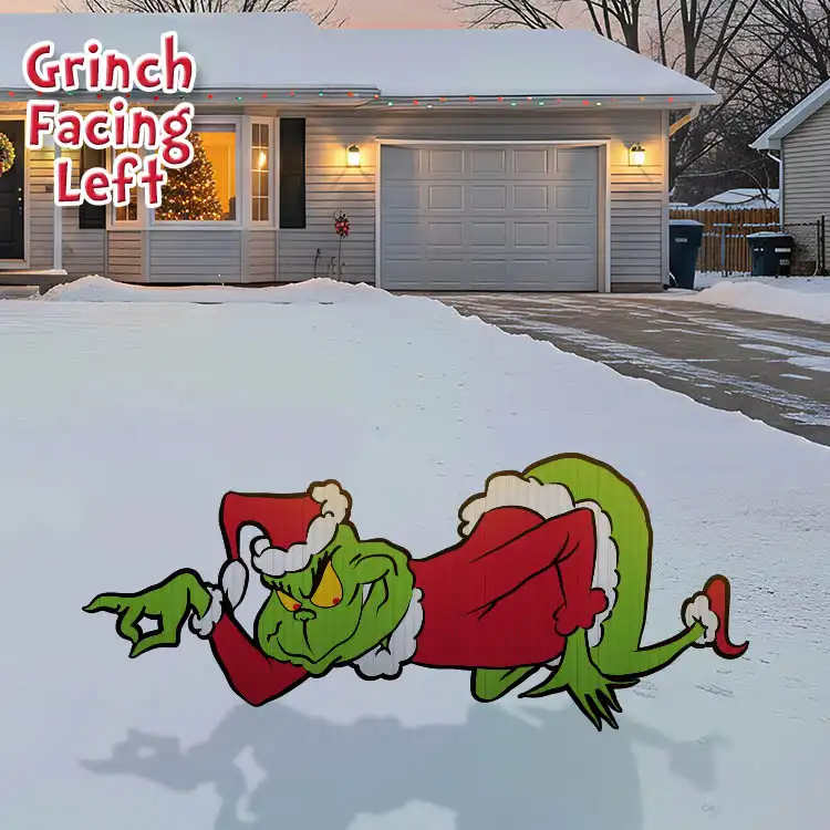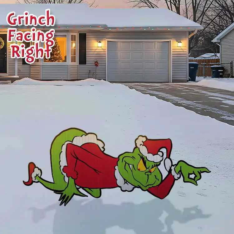 The Sneaky Grinch Stealing Christmas Lights Yard decoration made out of weather resistant 8mm corrugated plastic.