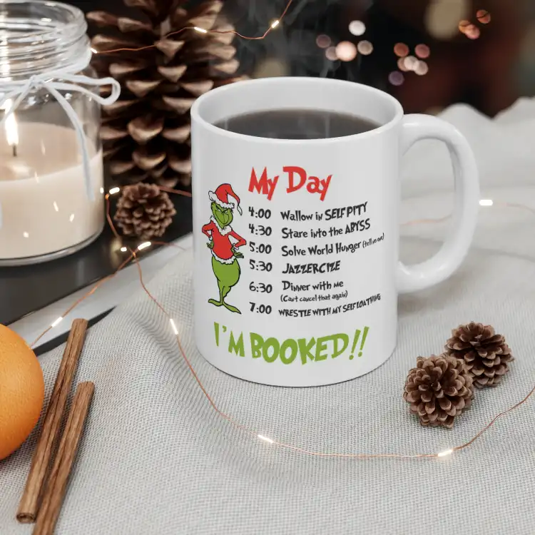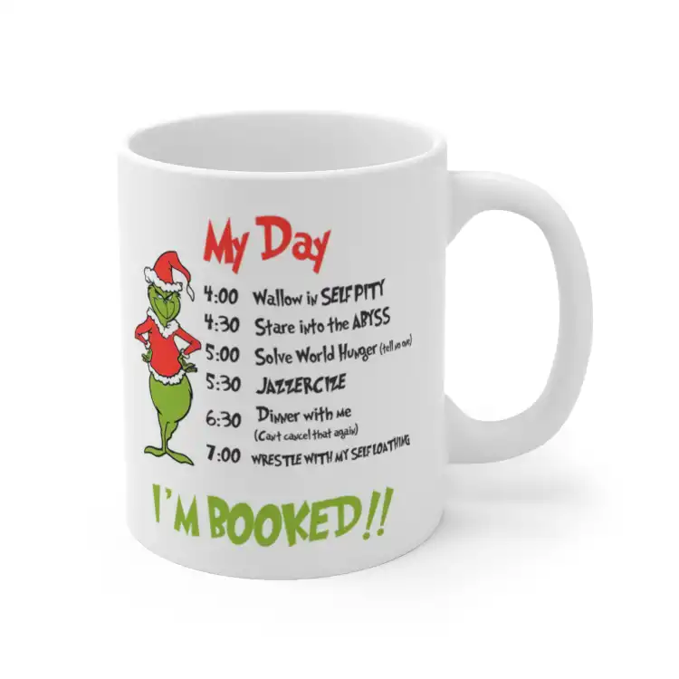 Start your day with a smile! Our The Grinch My Day I'm Booked! 11-ounce white ceramic coffee mug is the perfect companion for coffee lovers and Grinch fans alike. Featuring a fun and festive design, this mug adds a humorous touch to your morning routine or makes a delightful gift for the holidays. Durable and microwave-safe, it’s perfect for coffee, tea, or hot cocoa. Enjoy every sip with a dash of Grinchy cheer! Grab yours today and let the holiday spirit fill your cup!